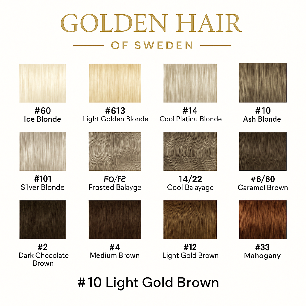 Upptäck vår exklusiva färgkarta med alla våra tillgängliga nyanser – från kalla isblonda toner till varma bruna balayage. Perfekt för dig som vill jämföra färger innan köp.
